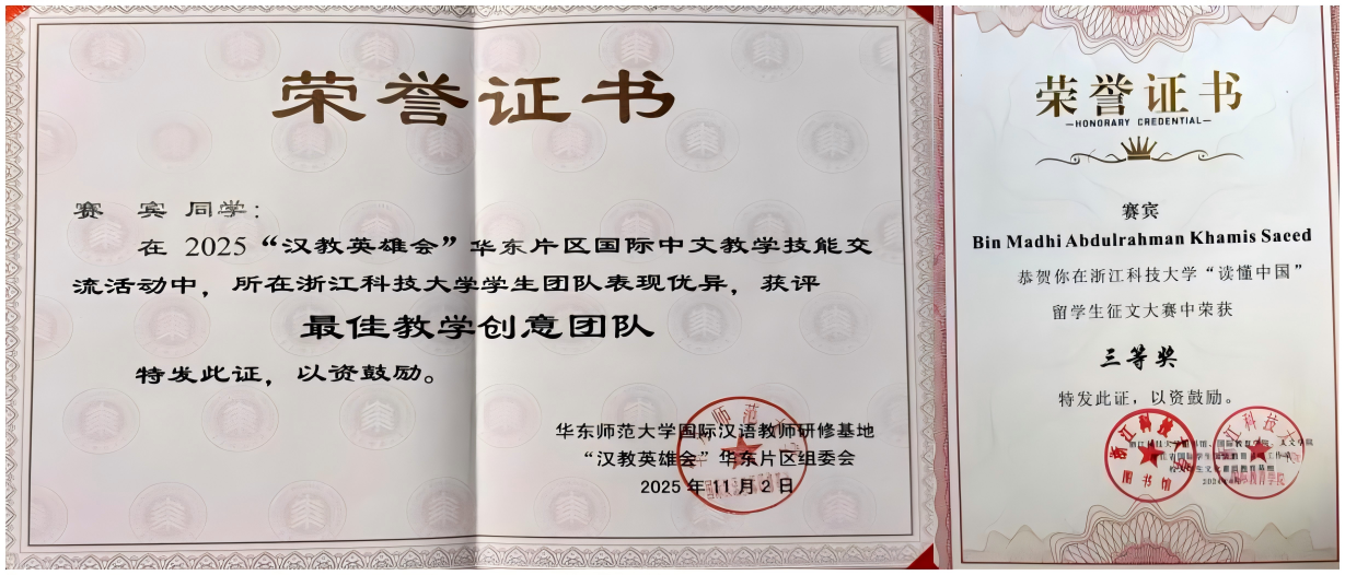 浙江科技大学为我的成长提供了广阔的平台,让我有机会参与各类专业实践与竞赛,在历练中提升自我。其中,2025汉教英雄会比赛、华东片区国际中文教学技能交流活动让我印象最为深刻。我和团队成员同心协力,在教学创意与技能展示中不断打磨,最终荣获“最佳教学创意团队”称号。这份荣誉不仅是对我们专业能力的认可,更坚定了我深耕汉语国际教育领域的决心。